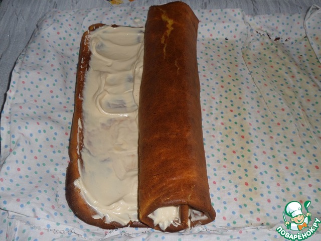 Остуженный свернутый рулетом корж раскручиваем. На морковный корж выкладываем приготовленный творожно - карамельный крем. Равномерно распределяем. Сворачиваем корж в виде рулета.