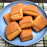 Получившееся тесто раскатать в ровный пласт, присыпав сверху сахаром (можно прокатать скалкой, чтобы вдавить сахар) и нарезать на квадратики.