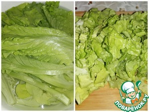 • Тщательно вымыть салатные листья, порвать или порубить.