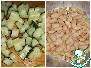 • Нарезать средним кубиком огурец. Фасоль откинуть на дуршлаг и промыть холодной кипячёной водой.