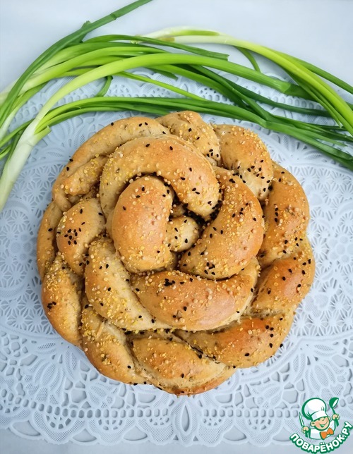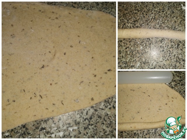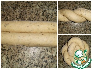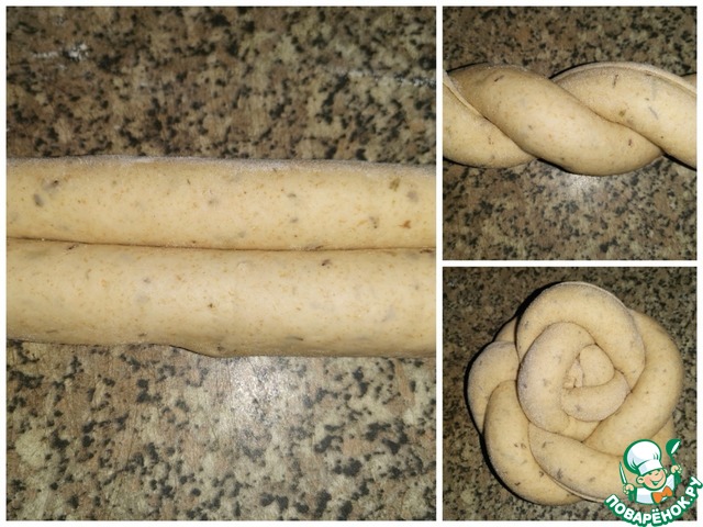 Затем два рулета переплести друг с другом. И свернуть, как на фото. Уложить получившийся цветок в середину, смазанной маслом, формы d=20см.
