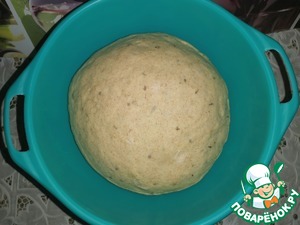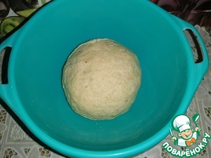 Влить в сухую смесь и замесить тесто. Месить до тех пор пока тесто не будет отставать от стенок чаши. Скатать колобок, закрыть чашу полотенцем или пищевой плёнкой и оставить в тёплом месте до увеличения теста в объёме.