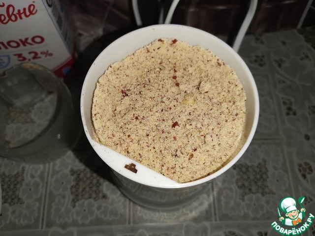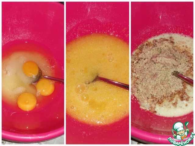 Перемешать в чаше сахар, соль, 2 яйца и 1 желток. (БелОк не трогать!) Влить кукурузное масло, молоко и перемешать. Затем всыпать измельчённый арахис, снова хорошо перемешать.