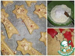 Муку смешать с корицей и разрыхлителем. Просеять в яичную смесь, замесить эластичное тесто. Тесто раскатать в пласт толщиной около 4 мм, формочкой вырезать печенье, смазать яичным белком (мы откладывали его) и посыпать порубленным арахисом.