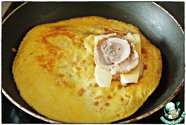 После того, как уложили хлеб, переворачиваем лопаткой на другую сторону и опять прижимаем омлет к хлебу... Сверху на один ломтик хлеба (который под омлетом) кладём мясную вкусняшку, затем ломтик сыра и опять накрываем мясным изделием...