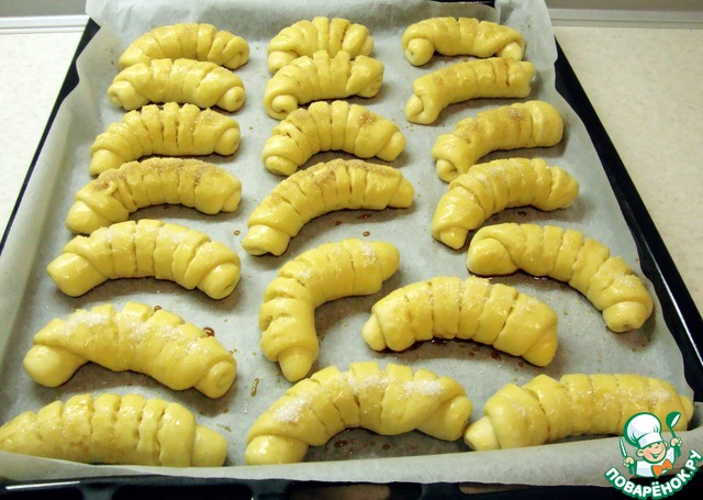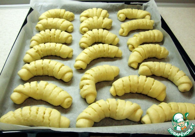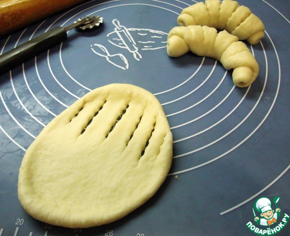 Раскатать каждый кусочек теста в овальную форму и с одного края сделатть разрезы.