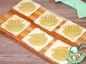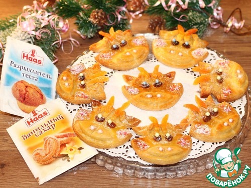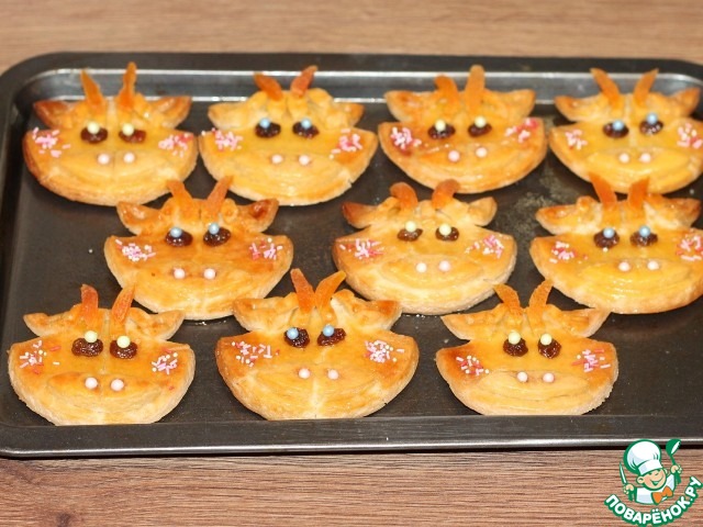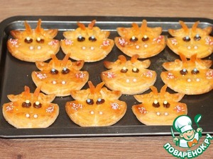 16. Разогреваете духовку до t 180 С и выкладываете охлажденные заготовки на застеленный противень. Выпекаем бычков в разогретой духовке до золотистой корочки, минут 15-20. Затем смазываете взбитым желтком и на 5 минут в духовку до румяной корочки.