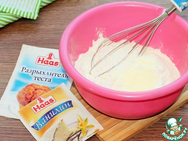 3. Смешать муку с разрыхлителем теста, ванилином и просеять. Добавить маленькую щепотку соли и перемешать.