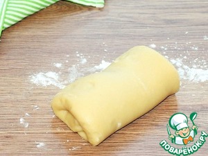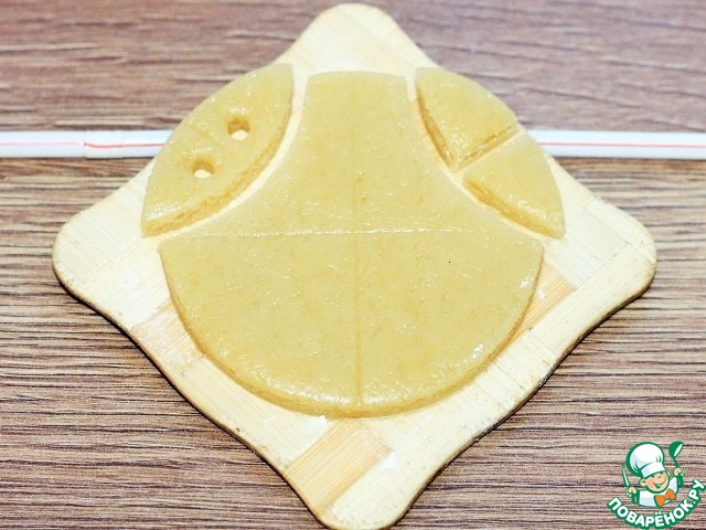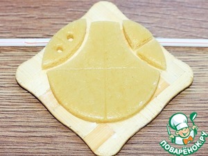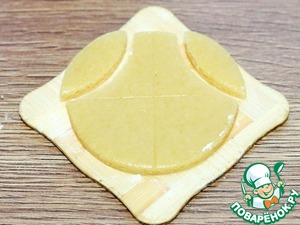 7. Припыляем мукой поверхность на которой будет лежать 1 кружок. Кружок визуально делим на 4 части или слегка, аккуратно наносим линейкой черту. Почему слегка, потому что при выпечке или пропитке, кружок может треснуть.