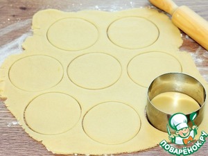 6. Припылить столешницу мукой и раскатать тесто в пласт, толщиной 4-5 см и вырезать кружочки Ф=8 см, 10 штук. Убираем кружочки в холодильник и для формовки достаем по одному.