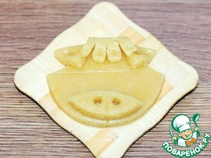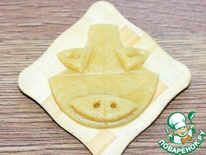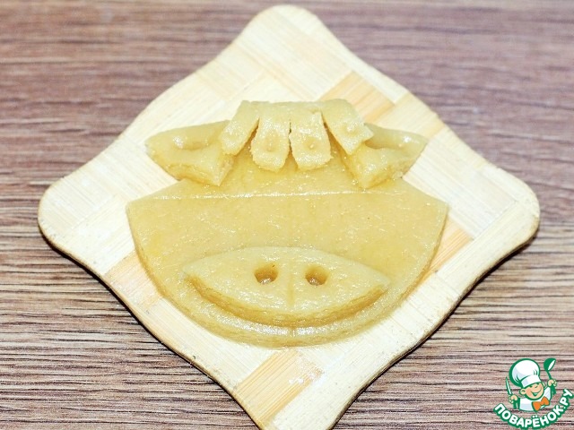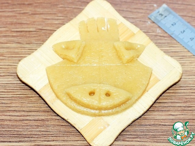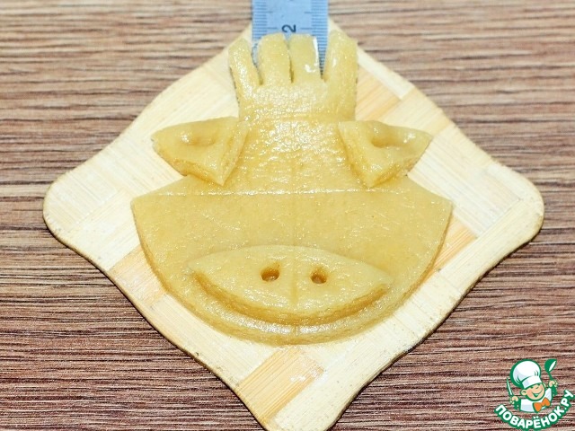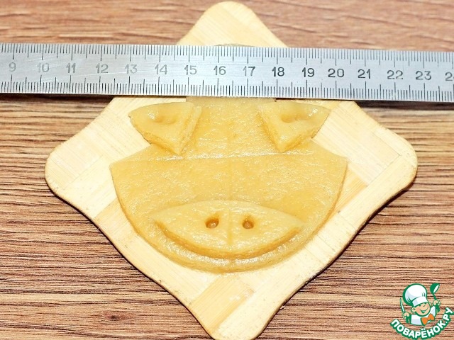 Вторую вырезанную часть делим пополам - это уши, и оставшаяся часть станет мордочкой быка. -
