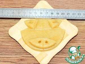 19. Пропитанное и немного обсохшее с низу печенье украшаем: из изюма - глаза, курага - рога и цветной посыпкой - щеки. И не забываем, прежде, чем украсить и "прилепить" декор, немного смазываем мордочку взбитым яйцом.