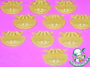 У каждого кружочка, этой же формочкой (круглой), отрезать два сектора справа и слева.