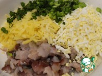 Сложим все продукты начинки : картофель, яйца, скумбрию, лук, укроп в миску.
