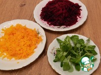 Натрем морковь и свеклу на средней терке. Зелень промоем. Если свекла сочная, отожмем ее от сока, уберем излишки влаги.
