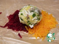 Расстелим пленку, разложим на ней свеклу и морковь. Сверху выложим шарик-начинку. Поднимим края пленки и обожмем свеклу с морковью вокруг начинки. Перекрутим пленку вокруг шарика, получится как конфетка, руками прижмем верхний слой к начинке, получится красивая обертка из моркови и свеклы. Надо, конечно, приноровиться к этому процессу.