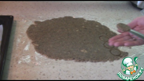 Потом берем небольшую круглую вырубку, можно взять рюмку и выдавливаем печенье. Переносим на противень с помощью ножа. Противень застилаем пергаментом.