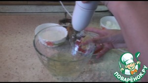 Потом продолжая взбивать, всыпаем понемногу сахар и ванильный сахар. Взбиваем безе.
