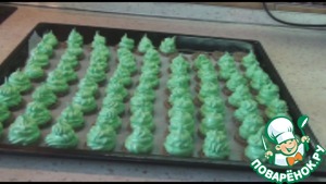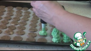 Старайтесь, чтобы безе не выходило за края теста, так потом красивее смотрятся готовые печеньки, а там где вышло, образовались небольшие подтёки.