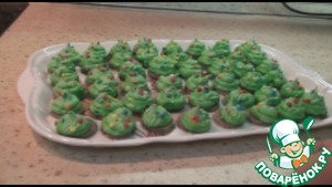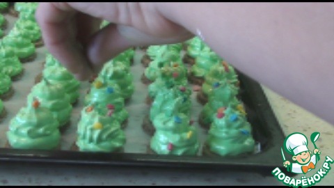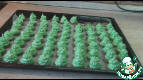 Перекладываем безе в кондитерский мешок, насадку я взяла звездочку и отсаживаем на печенье ёлочки.