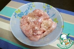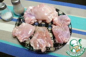 Для этого блюда я покупаю готовый полуфаботкат из курицы - бедра без кожи и костей. Каждое бедро помыть и разрезать пополам. Посолить и поперчить каждый кусочек.