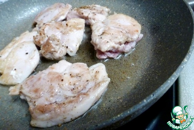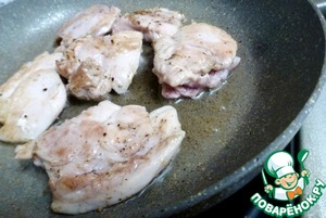 На разогретой сковороде быстро обжарить кусочки бёдер.