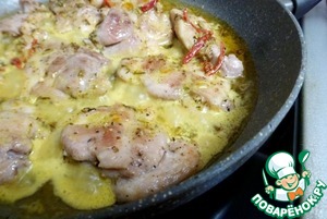 Влить в сковороду соус, убавить огонь и тушить бёдра в соусе под крышкой минут 20-25. Соус покрыл кусочки курицы наполовину, поэтому в процессе приготовления я их перевернула на другую сторону.