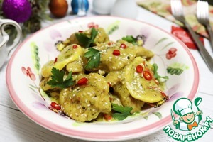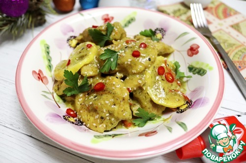 При подаче посыпать зеленью, колечками чили и поджаренным кунжутом.