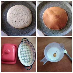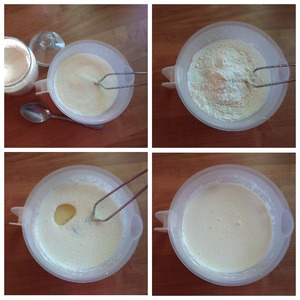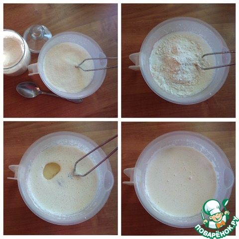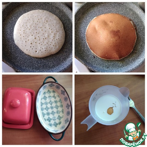 Греем хорошо сковороду. Тесто я замешивала в посуде с носиком, очень удобно из неё наливать его на сковороду. Мне нужны толстые блины небольшого диаметра ~ 15-17 см. Начинаем разливать теста от центра. Когда блин схватится и будет "ноздрястым", легко переворачиваем его на другую сторону и дожариваем. Снимаем на тарелку, накрываем колпаком. Из этого количества теста у меня получилось 8 блинов. Запеканку я буду делать на двоих и возьму небольшую форму, обмажу её всю маслом сливочным. Сделаю заливку. Сливки, яйцо, сметану и манную крупу вилкой соединю до однородной массы в стакане с носиком.