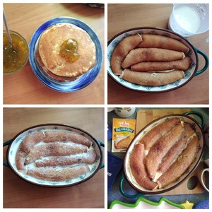 Блины я промажу джемом по всей окружности, сверну в рулетики и выложу плотно в форму. У меня поместилось 5 шт блинных рулетиков. Заливаем форму с блинами приготовленной смесью и ставим в духовку на 20 минут, выставив т-180 С. Ориентируйтесь по своей духовке. Как блины сверху красиво зарумянятся и заливка схватится, готова запеканка.
