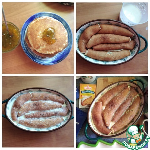 Завтраки тоже бывают праздничные. Предлагаю вам попробовать ванильную запеканку из манных блинов с джемом, запечённых в сливках и сметане с яйцом.