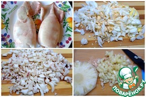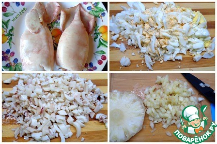 Яйца отварить 10 минут. Кальмары почистить, отварить 3 минуты. Охладить. Яйца, кальмары, ананас нарезать произвольно.