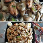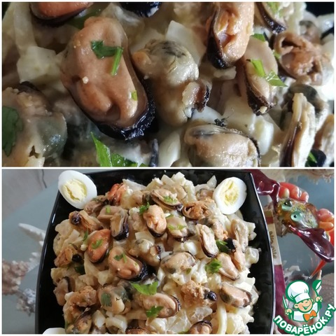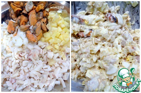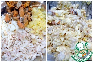 Соединить яйца, кальмары, ананас, 1/3 часть мидий. Добавить соус и перемешать.