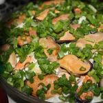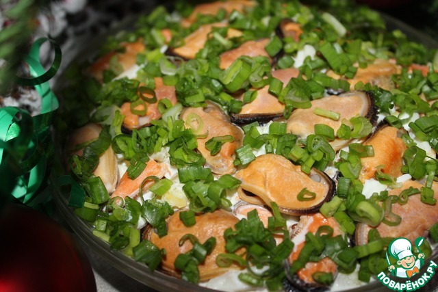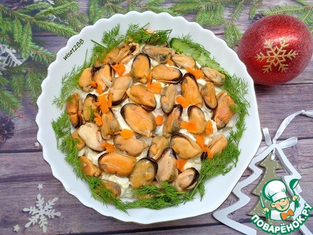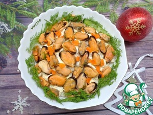Выложить в салатник и разложить сверху мидии. Оформить укропом.