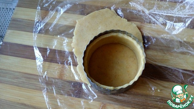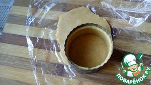 Вырежьте из теста полоски шириной 2,5-3 см (высота ваших форм) и длиной равной длине их окружности. Выложите в кольца для тарталеток диаметром 7см. Этим же кольцом я вырезаю дно, и оно сразу приклеивается. Отправьте на полчаса в холодильник.