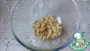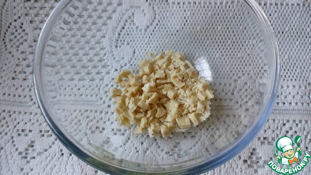 Приготовим крем. Желатин залейте 6 ч. л. воды, размешайте и оставьте на 30 минут. Нарежьте шоколад и сложите его в термостойкую миску.