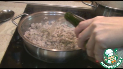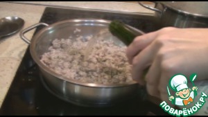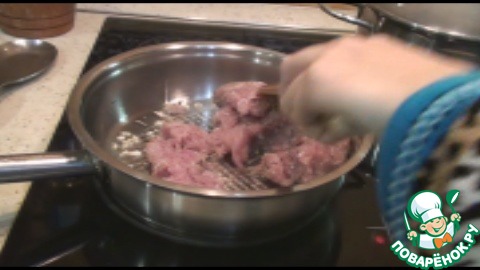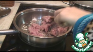 На небольшом количестве масла обжарим две минуты мелко нарезанный зубочек чеснока. Потом добавляем фарш. Обжарим три минуты.