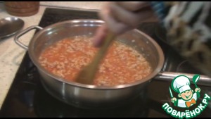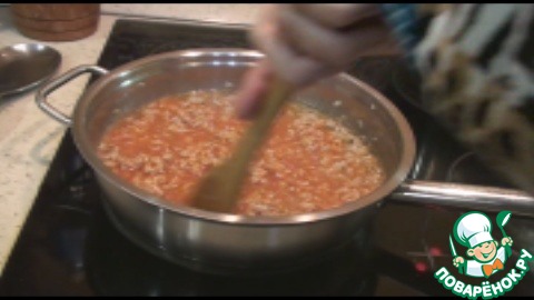 Потом добавляем томатный соус и на небольшом огне готовим минут 10, до готовности фарша.