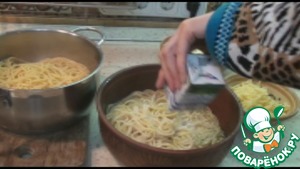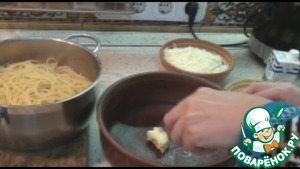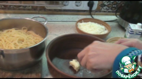 В отдельной кастрюле отварим до состояния "аль денте" спагетти. В форму для запекания кладем небольшой кусочек масла и смажем им форму.