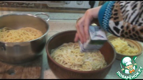 Выкладываем половину спагетти, сверху заливаем сливками.