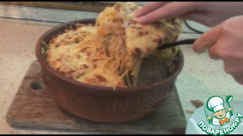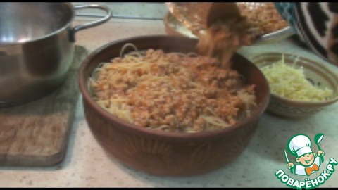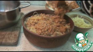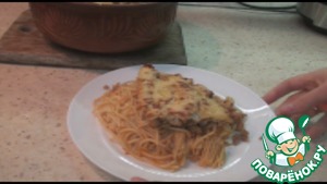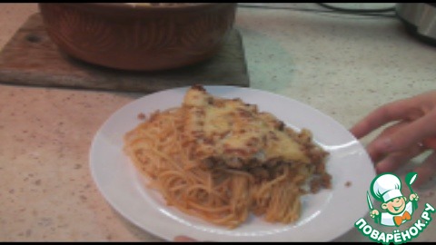 Выкладываем оставшиеся спагетти, на них выкладываем мясной соус.