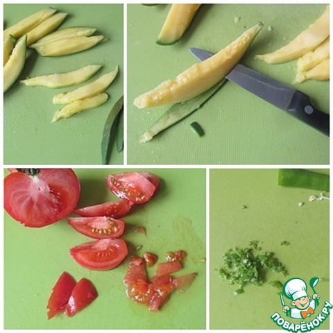 Половинку манго нарезаем ломтиками и срезаем кожуру, мякоть нарезаем кубиками. Тоже самое проделываем с половинкой мясистого помидора.