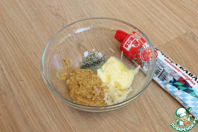 В мисочке смешиваю горчицу, размягченное сливочное масло, орегано, перец черный молотый. Добавляю чеснок, натёртый на мелкой тёрке. Солю по вкусу. Перемешиваю.