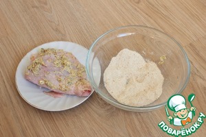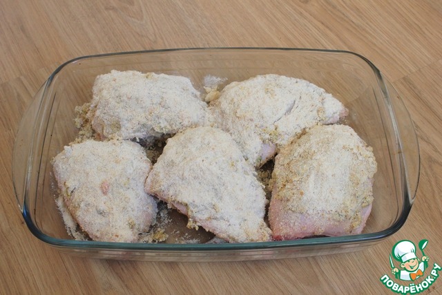 Затем каждое бедро окунаю в панировочные сухари той стороной, на которой кожа. Нижнюю часть не планирую. Окунаю очень тщательно, чтобы на поверхности получился толстый слой панировочных сухарей.