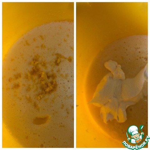 Добавить масло комнатной температуры и цедру с половины лимона натертую на мелкой терке. Взбить пол минутки. Добавить сметану, взбить пару секунд.