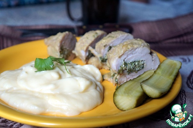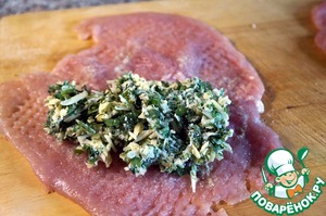Филе индейки, скрученное в рулет и начиненное смесью сыра и зелени, блюдо легкое и очень праздничное. Чтобы рулет внутри получился еще и сочным, твердый сыр я смешал с творожным.