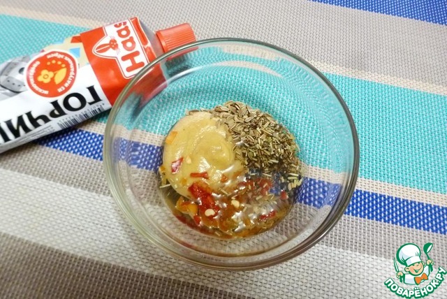 Смазать приготовленным горчично-лаймовым маринадом со специями. Старайтесь, чтобы маринад попал в разрезы тоже.