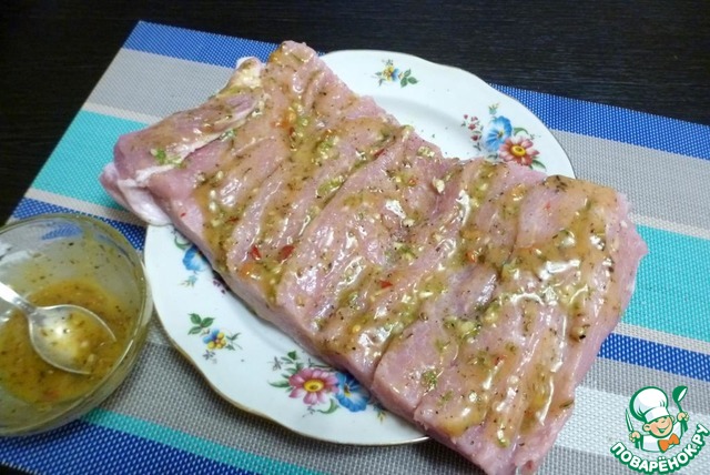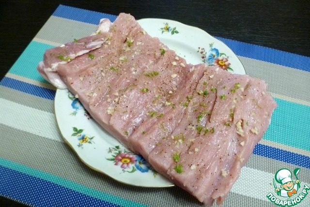 Хороший кусок мяса, у меня карбонад, разрезать ровным пластом. В толстых местах сделать насечки, чтобы мясо лучше промариновалось. Хорошо посолить и поперчить.