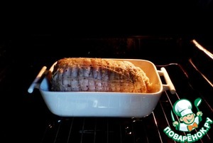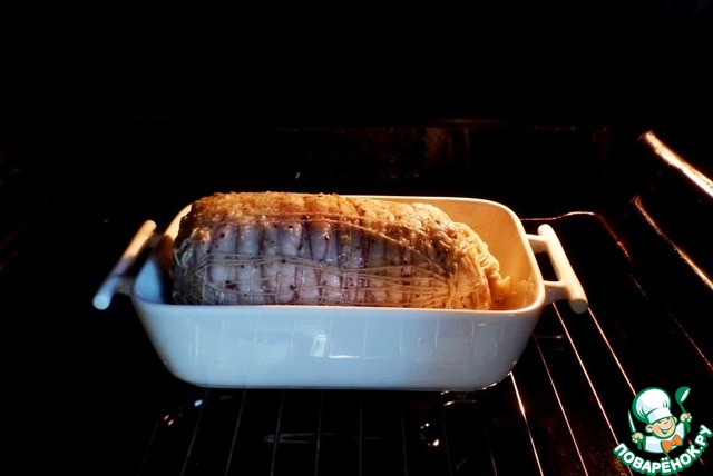 Полить сверху растительным маслом и поставить в духовку при температуре 220 градусов на 30 минут. Затем снизить температуру до 130 и запекать ещё час или час-двадцать (зависит от размера). Затем выключить духовку и дать "отдохнуть" поркетте в духовке ещё минут 20. -