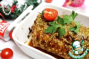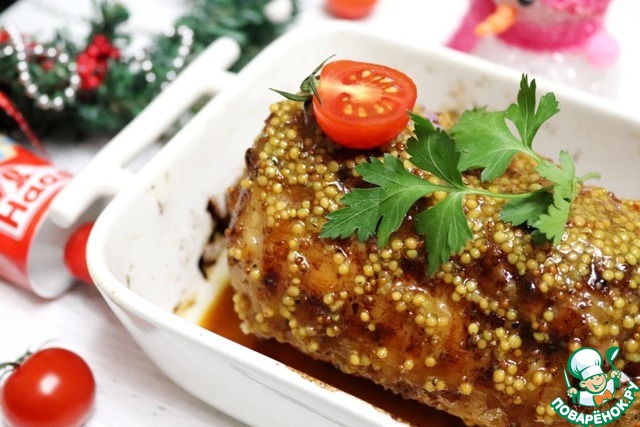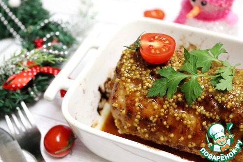 Смешать 1 чайную ложку мёда с 3 столовыми ложками горчицы с зернами и смазать верх поркетты, предвварительно удалив сетку.